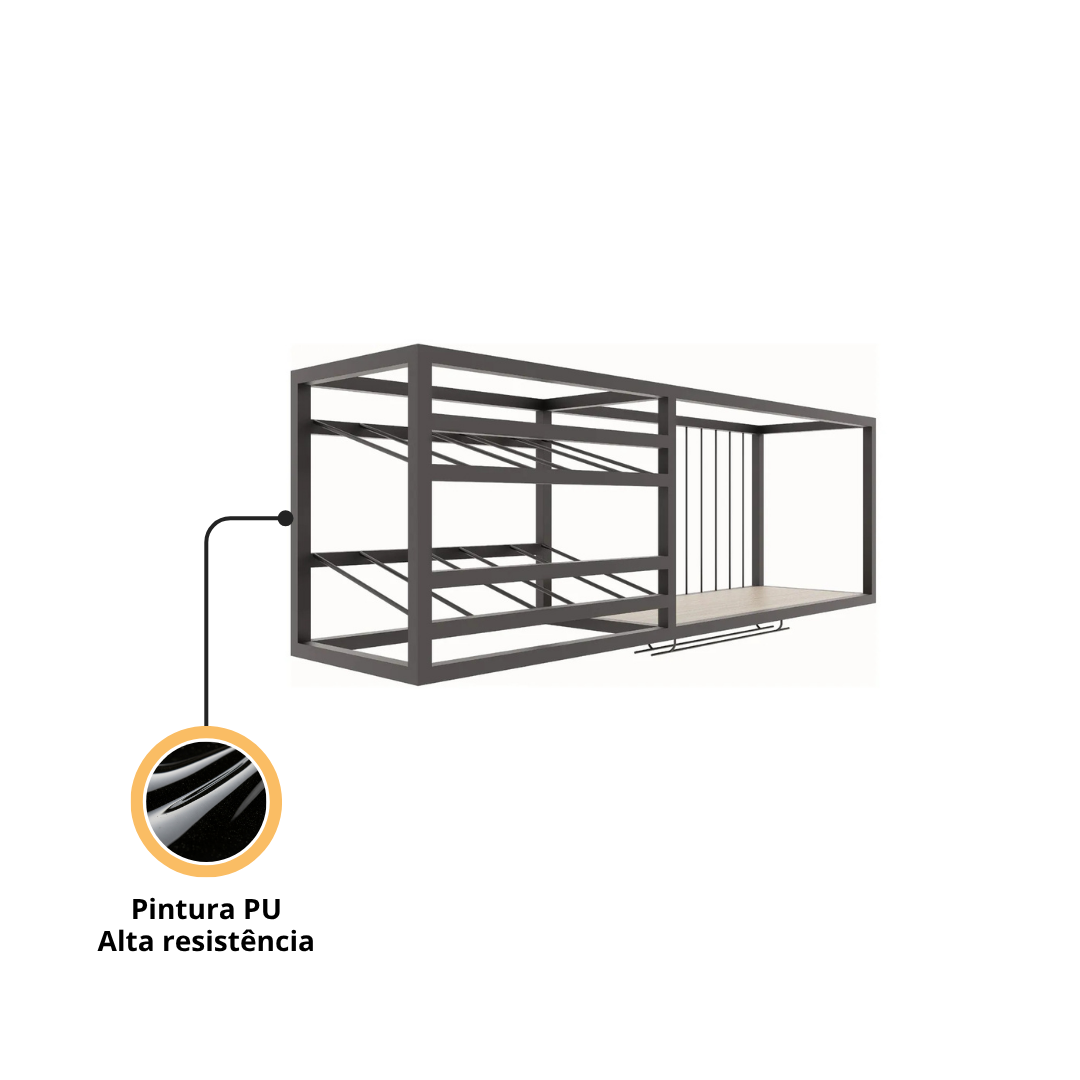 - Compartimentos metálicos reforçados para apoiar garrafas e taças com segurança e boa organização.